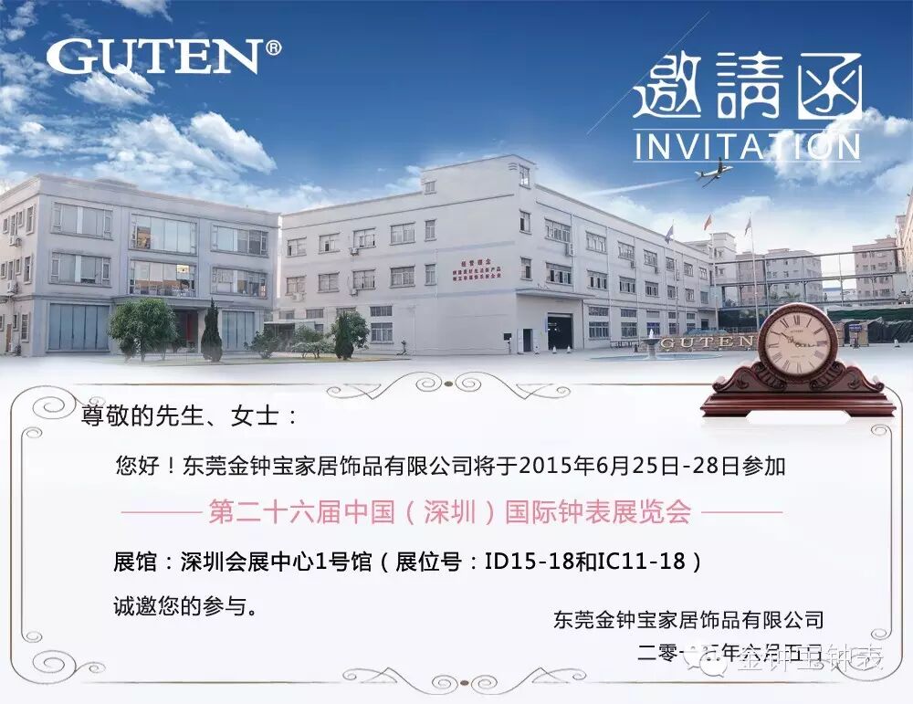 第26届深圳国际钟表展将于6月25日-28日在深圳会展中心1号馆开展,金钟宝诚邀您莅临我们的展位(ID15-18和IC11-18)参观指导!